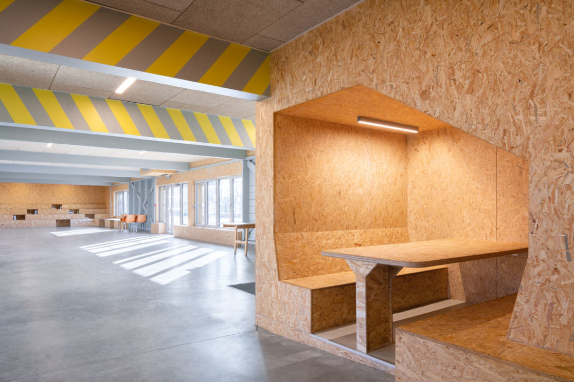 L’aspect environnemental était un critère important du projet : pose d’une ITE, installation d’une centrale double-flux, utilisation de peintures et de panneaux OSB sans COV, pose de faux-plafonds en fibre de bois, pose d’une menuiserie triple vitrage, utilisation de matériaux issus du réemploi pour les sols, les ossatures de rangement, le mobilier…