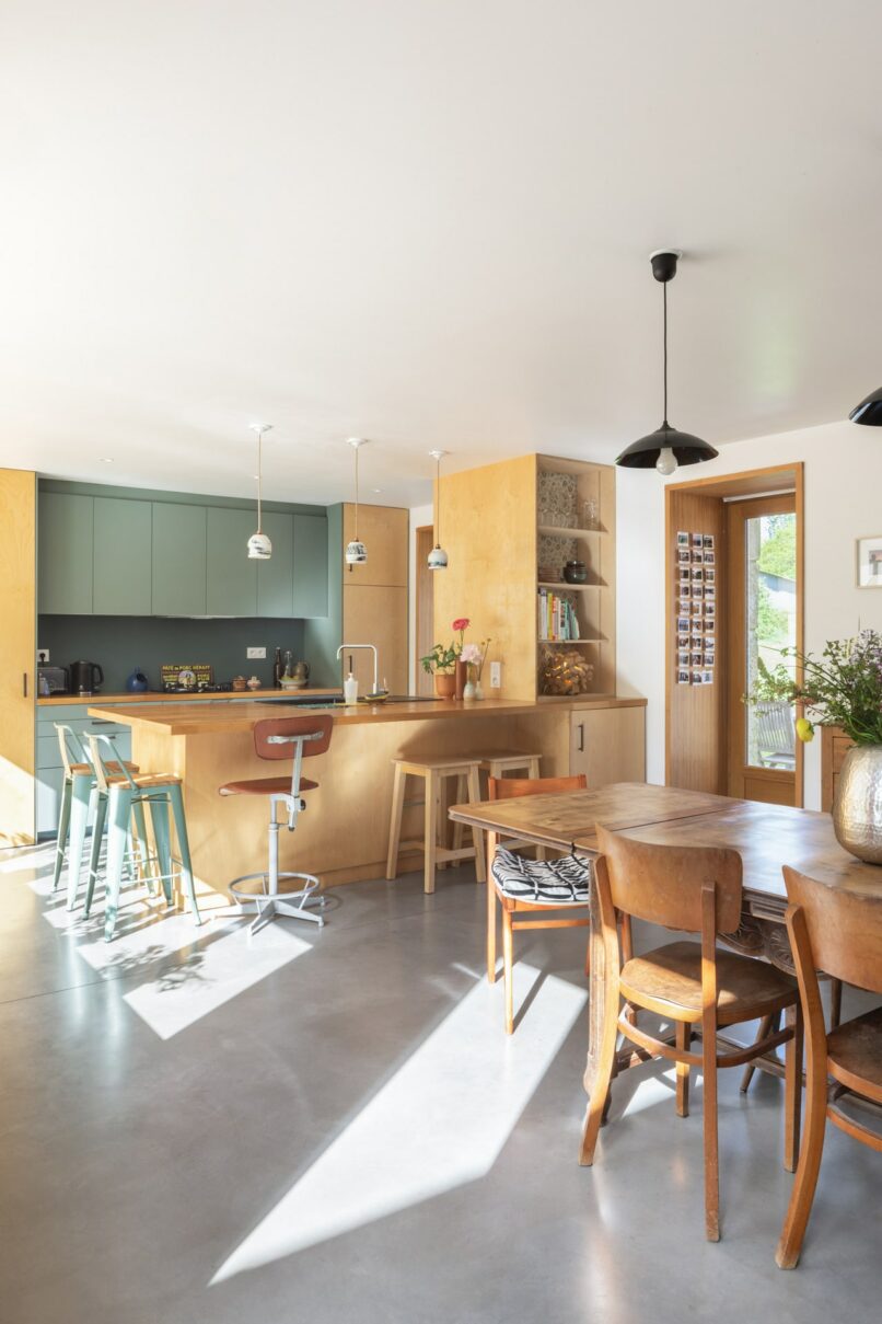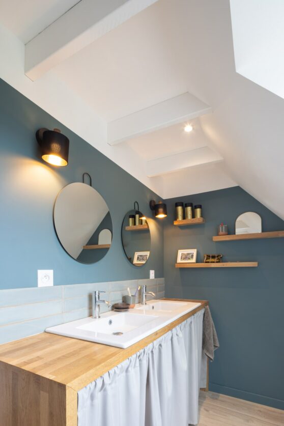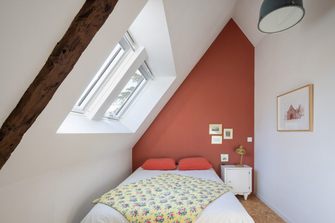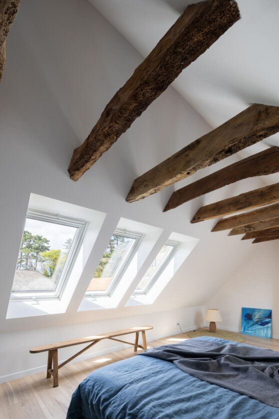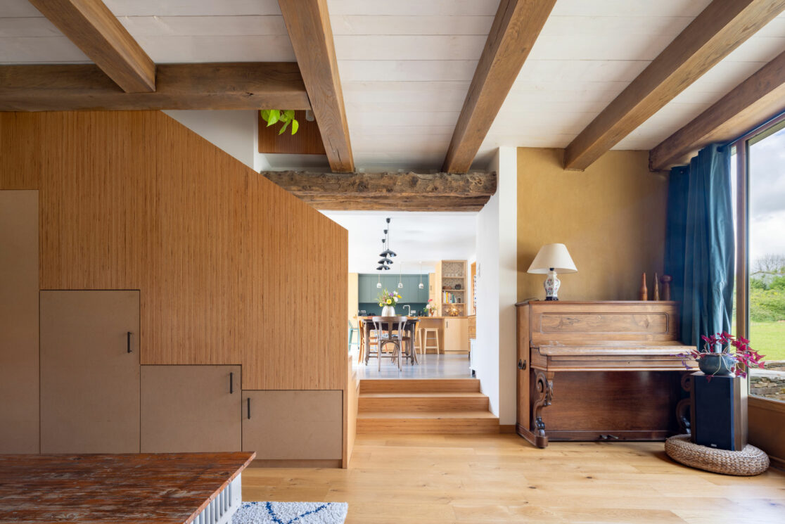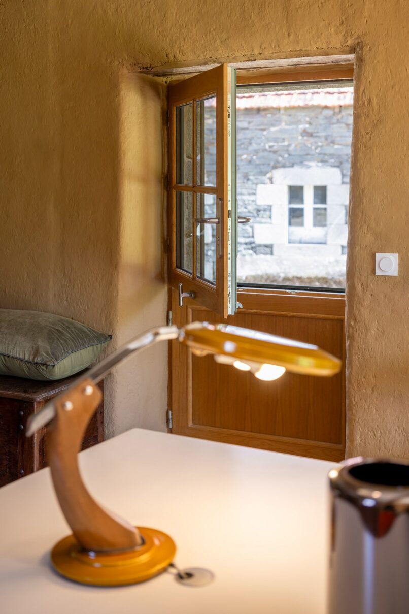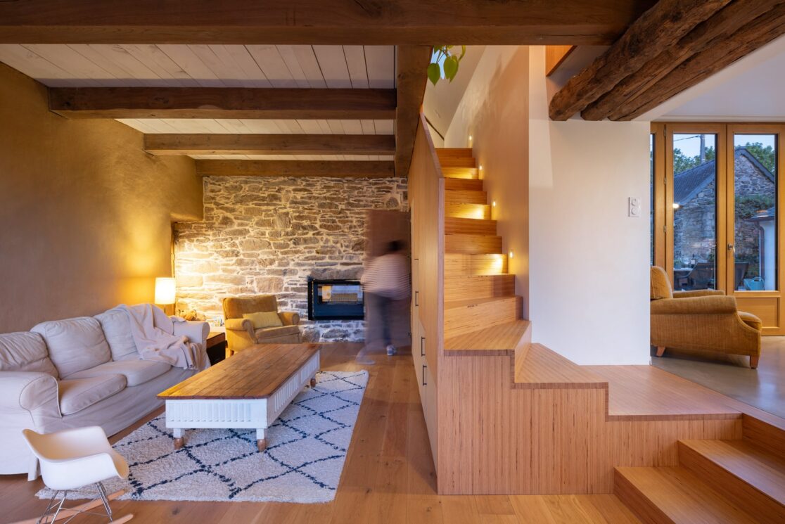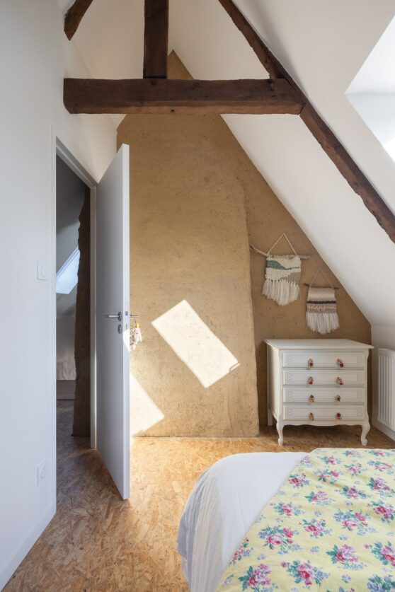 Nous avons restauré la moitié du bâti selon les règles de l’art et réalisé des enduits en terre et paille. Pour la mise en œuvre des enduits et des finitions en badigeon terre, des chantiers participatifs ont été organisés. L’autre moitié de la maison a été entièrement remaniée et remontée. Elle est aujourd’hui plus contemporaine, tout en ayant gardé l’inspiration du bâtiment et des volumes originels.
