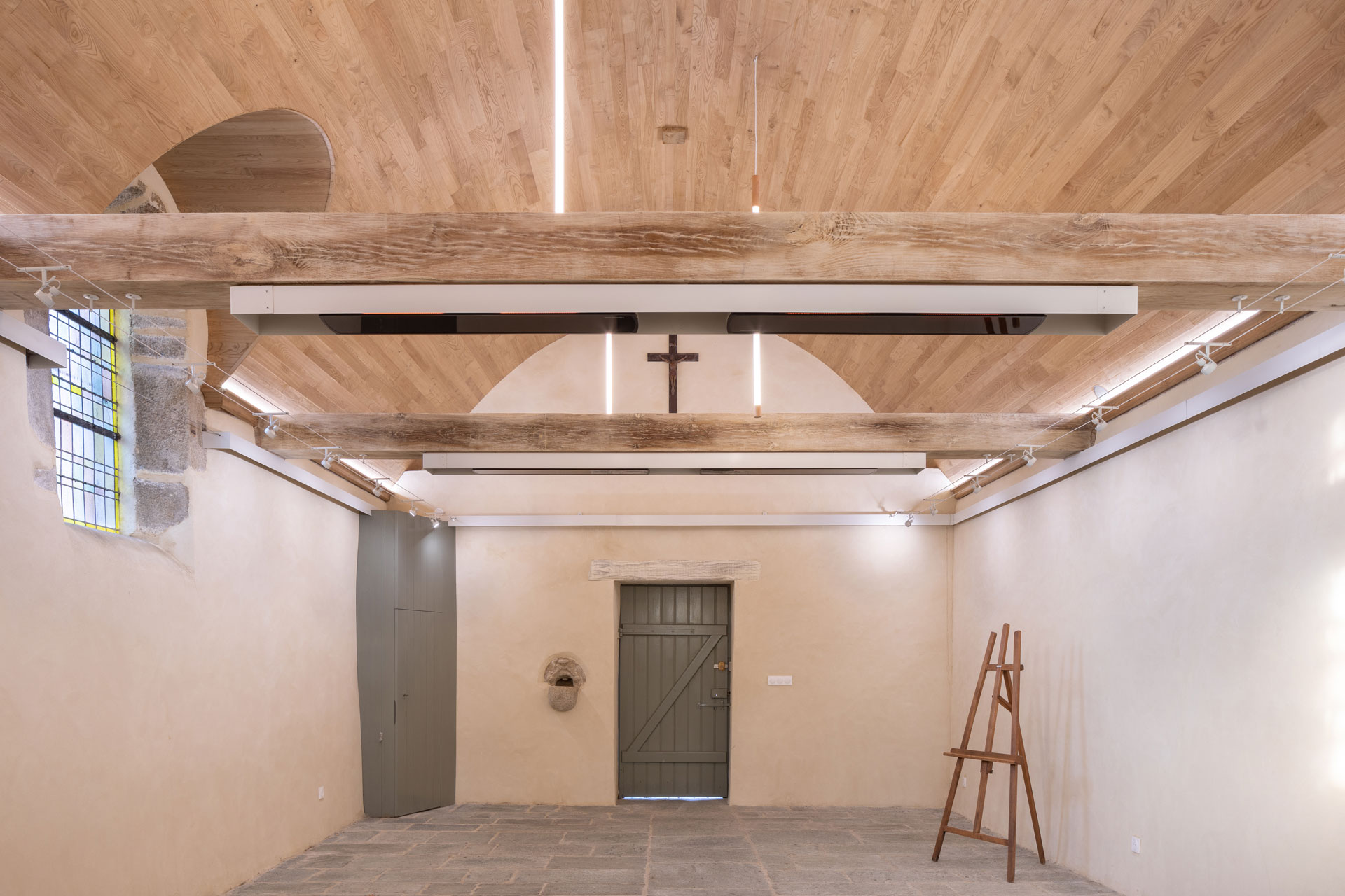 Le lieu a été restauré dans son intégralité : la charpente, la maçonnerie, l’électricité et la peinture ont été refaites. Les poutres cachent des radiateurs radiants, dans des pliages métalliques laqués en blanc. Ils permettent de chauffer la pièce de manière uniforme tout en étant cachés.